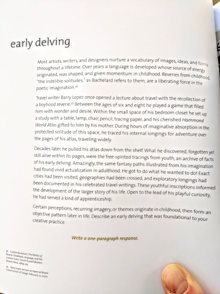 I’ve been working on childhood rememberings, as a general concept, because I don’t have easy access to them. So I’ve sort of been doing it the other way around – imagining a childhood that fits the facts I can actually observe. I think it turns out rather the se for this exercise though. Here are some facts I know about my early life – that I had lots of maps, that I was safest when I went unnoticed, and that I carried the same knife without losing it from like without losing it or having it confiscated for almost a decade. And here’s what I imagine I imagined from those facts – that I could learn to be prepared to survive anywhere, that I didn’t think I could do it without a knife, that people liked me best when the things I made changed their life without being seen, and that wear, decay and eventual loss were inevitable.